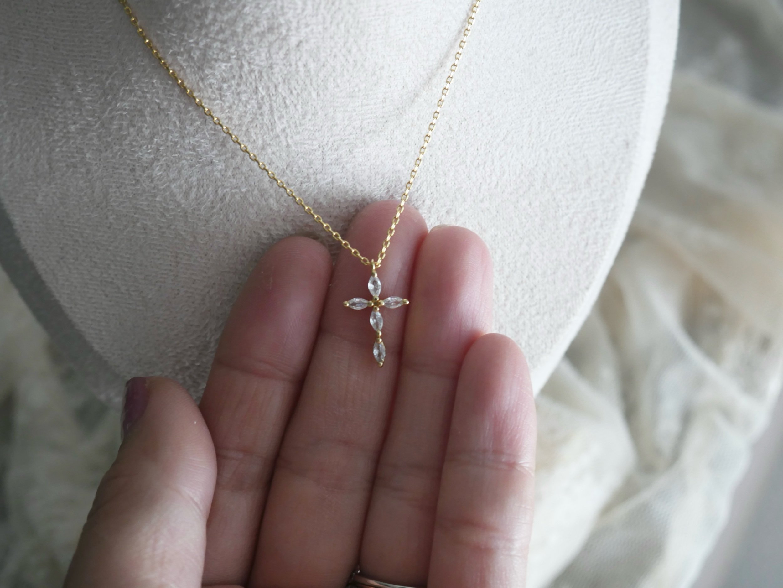 Faith meets elegance with this gold dipped brass, marquise cubic zirconia cross necklace. Sparkling with timeless elegance and heartfelt meaning—perfect for daily wear or gifting. A radiant reminder of God’s love for us and Christ’s complete sacrifice on the cross.